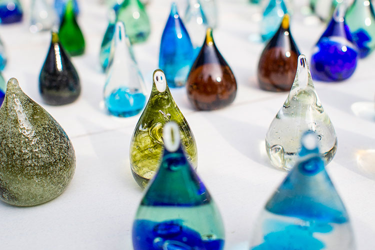 護国神社 蚤の市の写真、5枚連続更新中(の4枚目)。 これは古いものではなくて「吹きガラス工房 琥珀」さんの作品でガラスの雫。 かわいくて、よっぽど買おうかと思ったんだけど、 これはたくさん並んでるのがいいんだなと思いなおし、 これとは別の一輪挿しを買ってきました。