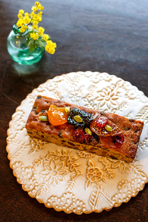 護国神社 蚤の市の写真、5枚連続更新中の5枚目は、買ってきたもの。 「JOICE ON THE TABLE」さんのお皿と て「吹きガラス工房 琥珀」さんの一輪挿しと、 熊本から出店されていた「KOKOPELLI」さんのフルーツケーキ。 一輪挿しにはミモザを挿してみましたよ。