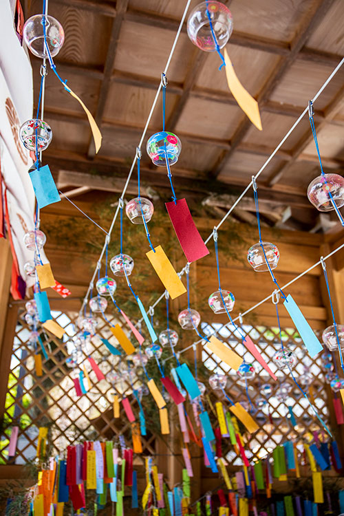 春日神社には手水舎以外にも本殿の手前の神門にも風鈴が吊ってあって 風が吹く度にチリンチリンと鳴り響きます。 (数があるので結構大きい音です) 両脇の七夕の笹飾りの短冊がカラフルです。