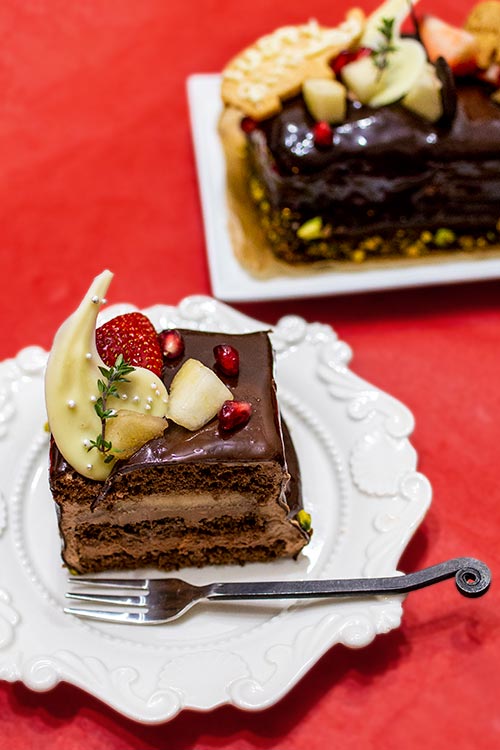 ラ・フランスのブランデーコンポートを合わせたチョコレートケーキに