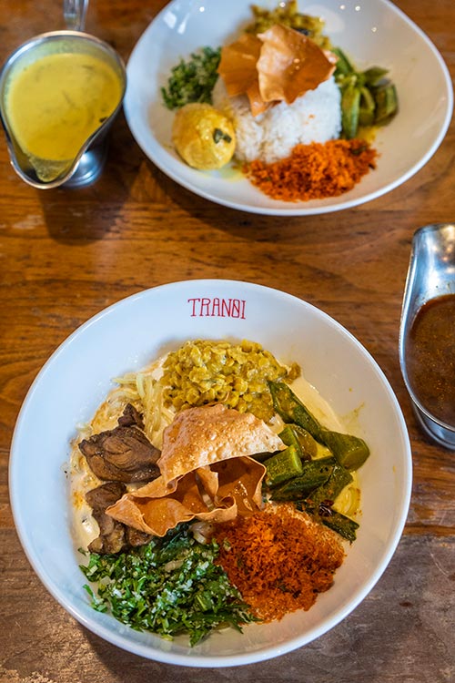 副菜がいろいろのったポルサンボル(ココナッツのカレー)がベースのカレークリームヌードルに