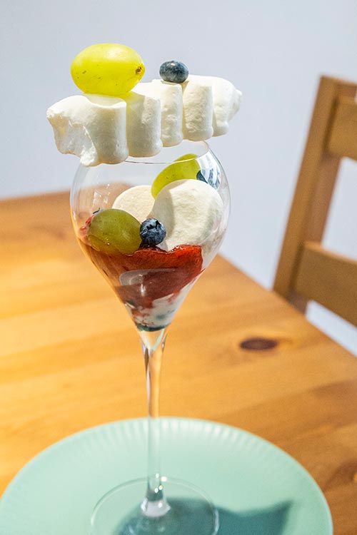 「季節のフルーツのヴァシュラン」とデカフェのカフェオレ。