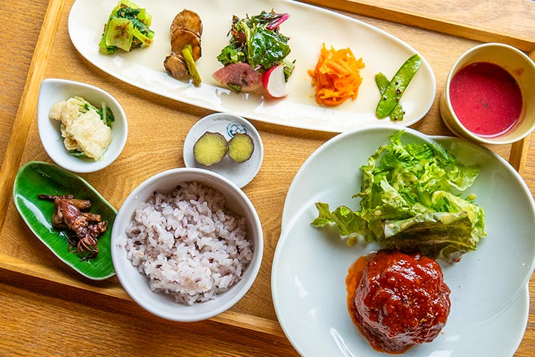 「大きいおかず」は「ハンバーグ」、食後のドリンクは豆茶を選びました。