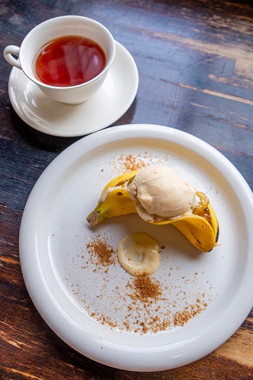 「バナナのキャラメリゼ+シナモンジェラート」と紅茶。