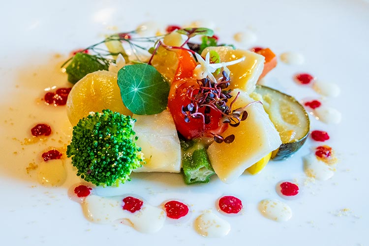 オードブルの「ホタテ貝ワイン蒸し・色とりどりのギリシャ風サラダ」。