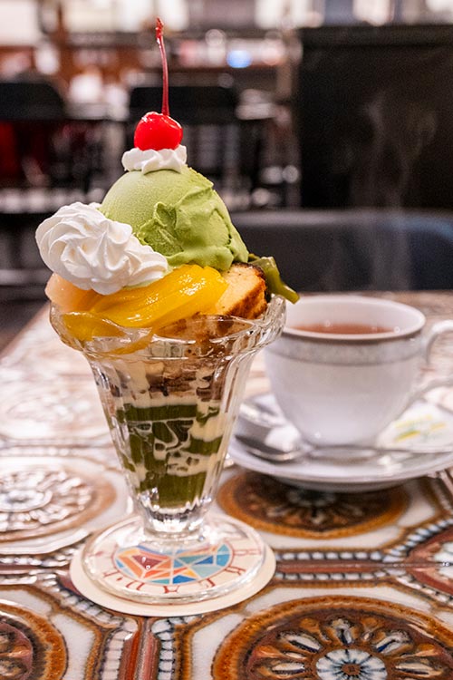 いただいたのは「パンとエスプレッソと堺筋俱楽部」4周年記念特別メニューの「抹茶と桃のパフェ」。