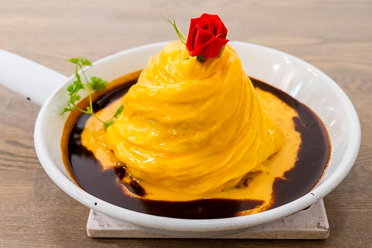 店名にあわせた白のフライパンの乗って出てきたオムライス。