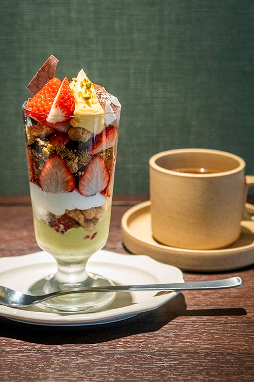 甘酸っぱい苺にチョコ、ザクザク食感のカダイフ、ピスタチオ、求肥など。