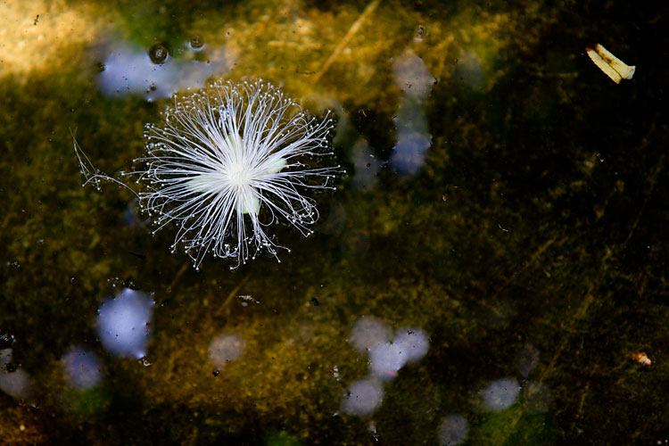 昨日に引き続き、福岡市植物園で撮った写真、3枚連続更新中(の3枚目)。 ふわふわしたのが散って水面に浮かんでました。 サガリバナというんだそうです。
