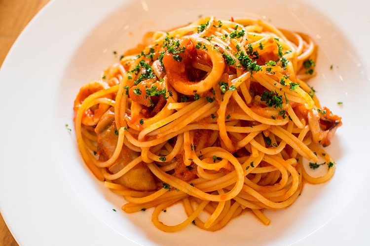 Est Luce(エストルーチェ)でランチ写真3枚連続で更新中(の2枚目)。 前菜盛り合わせの後にビシソワーズを挟んで、パスタ。 3種類の中からヤリイカとケッパーのトマトソースを選びました。 (フォカッチャもついてきましたよ)
