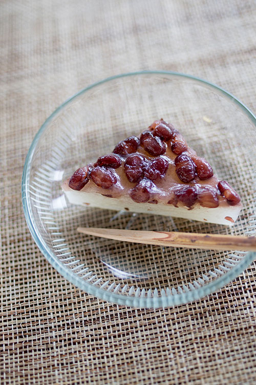 白い三角形は氷を表し、小豆は悪鬼払いのおまじないだそうです。